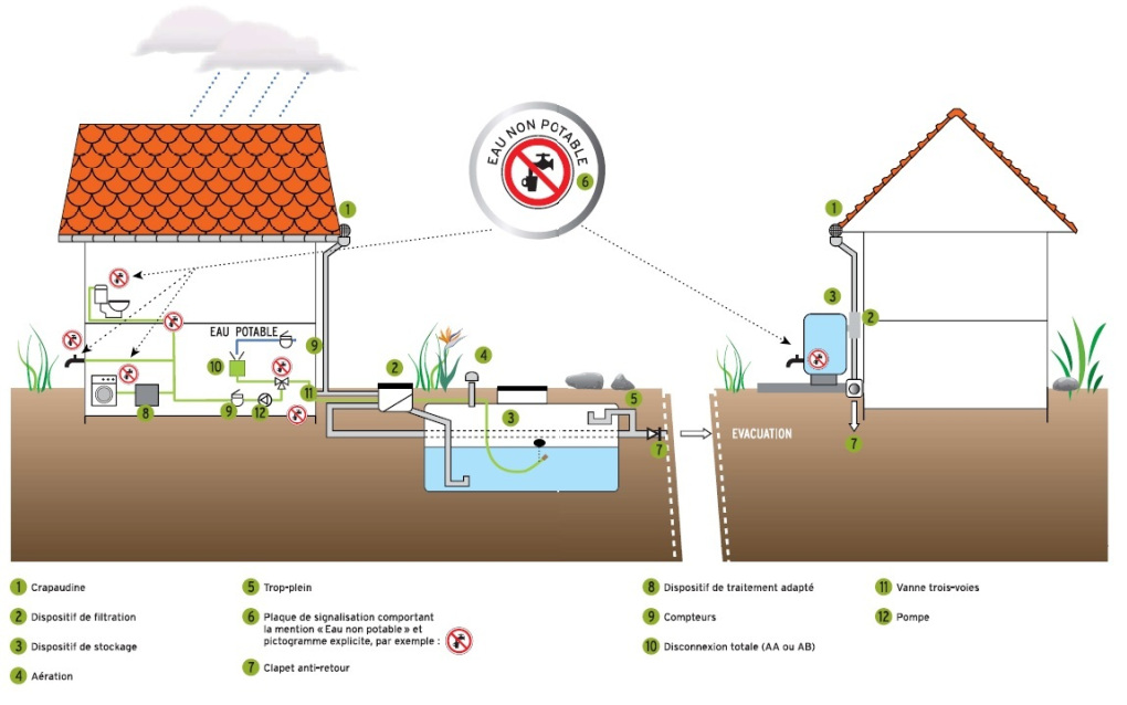 Les équipements de récupération de l'eau de pluie devront être conçus et réalisés, conformément aux règles de l'art, de manière à ne pas présenter de risques de contamination vis-à-vis des réseaux de distribution d'eau destinée à la consommation humaine. Le réservoir de stockage (3) devra être constitué de matériaux inertes vis-à-vis de l'eau de pluie. Ils sont fermés par un accès sécurisé pour éviter tout risque de noyade et protégés contre toute pollution d'origine extérieure. L'appoint en eau du système de distribution d'eau de pluie depuis le réseau de distribution d'eau destinée à la consommation humaine est assuré par un système de disconnexion (10). L'arrivée d'eau de pluie en provenance de la toiture est située dans le bas de la cuve de stockage. La canalisation de trop-plein (5) est protégée contre l'entrée des insectes et des petits animaux. Si la canalisation de trop-plein est raccordée au réseau d'eaux usées, elle est munie d'un clapet anti-retour (7). A proximité immédiate de chaque point de soutirage d'une eau impropre à la consommation humaine est implantée une plaque de signalisation qui comporte la mention « eau non potable » et un pictogramme explicite (6). Un dispositif de filtration (2) inférieure ou égale à 1 millimètre est mis en place en amont de la cuve afin de limiter la formation de dépôts à l'intérieur.